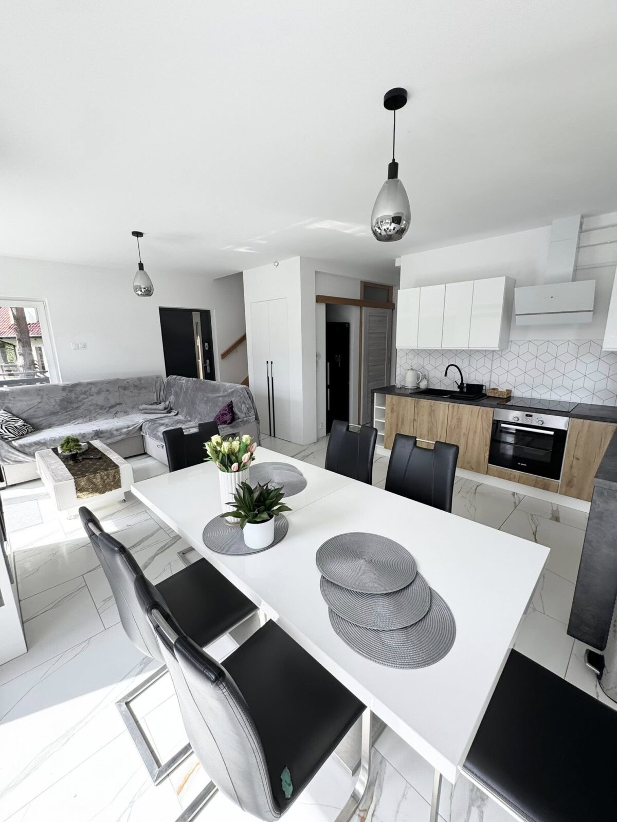 – salon z aneksem kuchennym i jadalnia, w salonie znajduje się narożnik z możliwością spania 2 osób